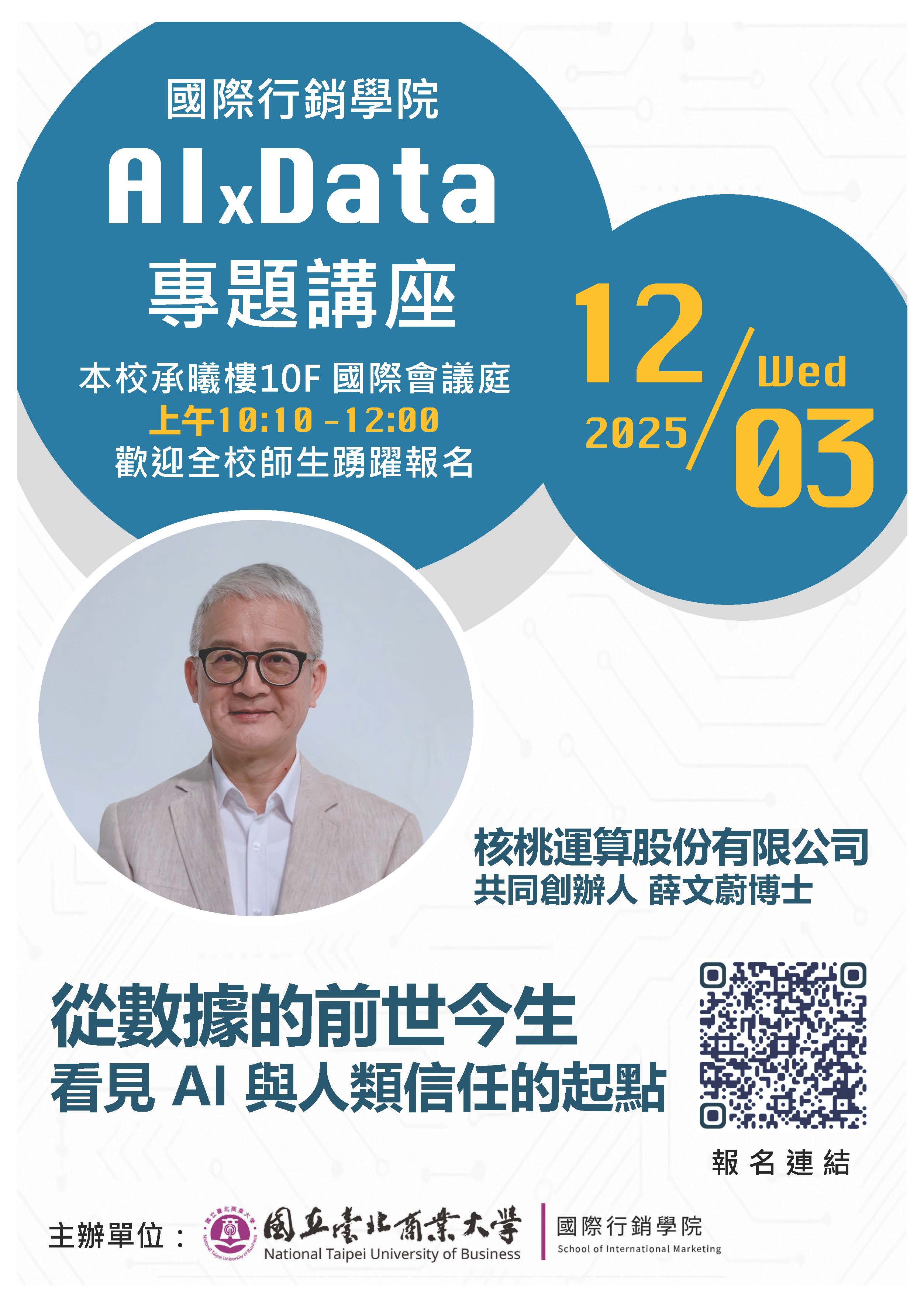 時間:114/12/3 上午10:10-12:00 演講題目:數據的前世今生 演講者:核桃運算股份有限公司薛文蔚執行長 地點:本校承曦樓10樓國際會議廳。